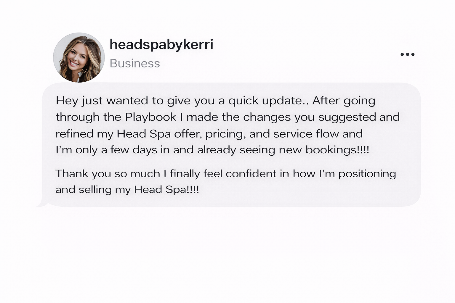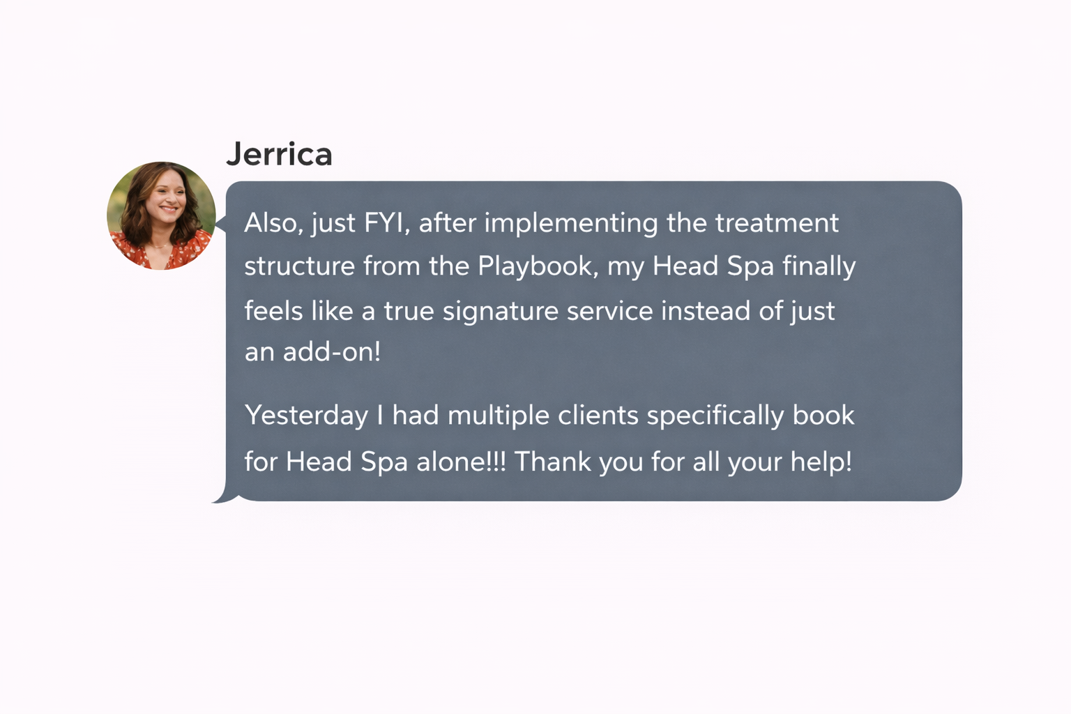YES â I WANT THE PLAYBOOKAnother used the pricing frameworks and finally stopped undercharging her Head Spa treatments.